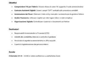 Si è svolta ieri la prima sessione del corso di formazione “Come usare l’Intelligenza Artificiale nell’Amministrazione e Contabilità. Strumenti pratici e Automazioni possibili per una Gestione Amministrativa efficiente”,