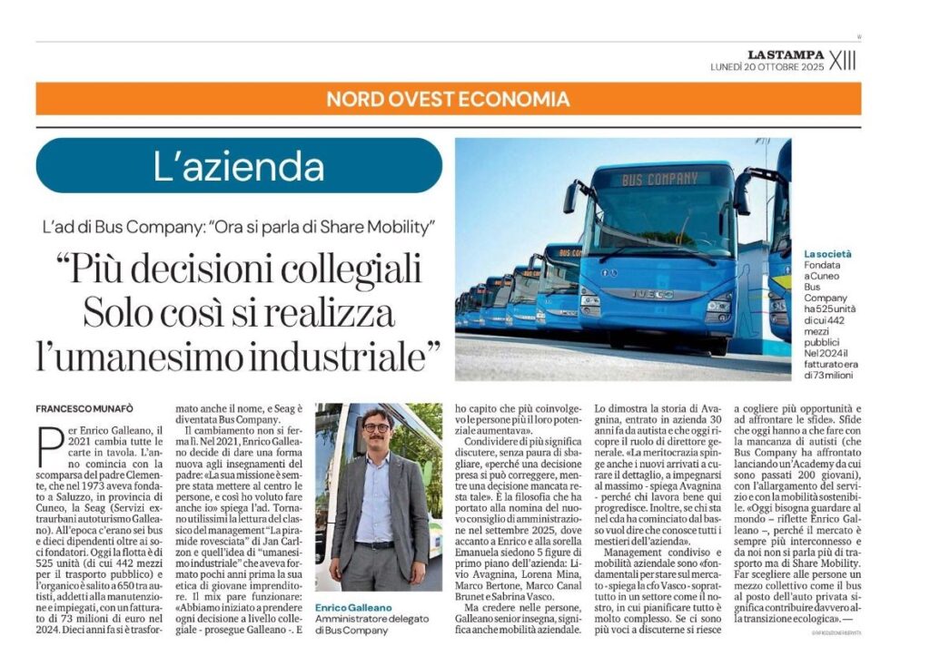 Nel numero di oggi de La Stampa, l’amministratore delegato di Bus Company, Enrico Galleano, racconta come l’azienda cuneese stia ridefinendo il proprio modello di impresa puntando su partecipazione, sostenibilità e innovazione sociale.