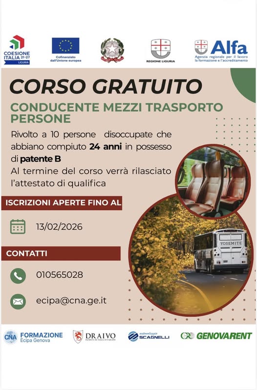 È attivo il corso gratuito per diventare conducente di pullman, promosso da Genovarent in collaborazione con CNA ed ECIPA, finalizzato al conseguimento della Patente D + CQC.