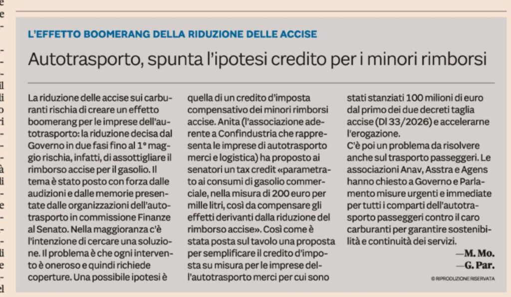 Come evidenziato anche oggi da Il Sole 24 Ore, il tema è al centro del confronto istituzionale. Una possibile ipotesi allo studio e’ quella di un credito d’imposta compensativo dei minori rimborsi accise.