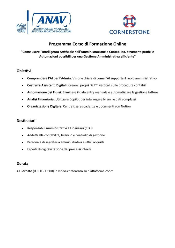 Si è svolta ieri la prima sessione del corso di formazione “Come usare l’Intelligenza Artificiale nell’Amministrazione e Contabilità. Strumenti pratici e Automazioni possibili per una Gestione Amministrativa efficiente”, organizzato da ANAV in collaborazione con Cornerstone International.